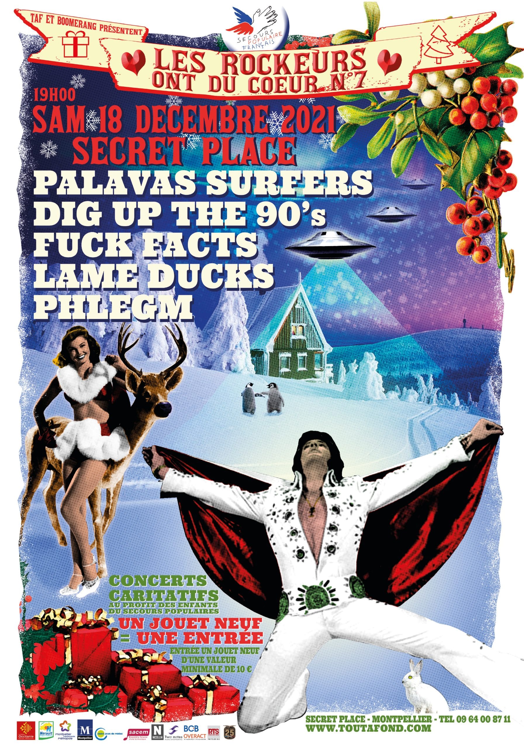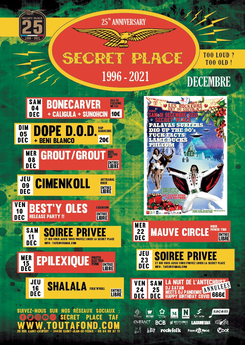 Pour cette fin d’année 2021, le public solidaire aura ainsi l’occasion d’assister à un concert aux multiples facettes, avec des artistes et des styles qui traduisent toute la diversité musicale de la Secret Place. Au programme : Palavas Surfers, Dig Up The 90’s, Fuck Facts, Lame Ducks et Phlegm… Du rock au punk rock, en passant par les grands hits des années 90 ou le heavy blues, de quoi stimuler toutes les oreilles !